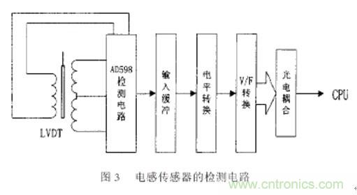 如圖3所示,由于采用了最新的大規(guī)模集成電路,電感傳感器的檢測電路比較簡單,且集成電路采用了新的調(diào)制解調(diào)方法和算法,減少了以前的檢測外差式調(diào)頻檢測電路方法由于傳感器的激勵信號的相角、頻率以及幅值漂移對檢測結(jié)果的影響,大大進步了檢測精度和穩(wěn)定性。