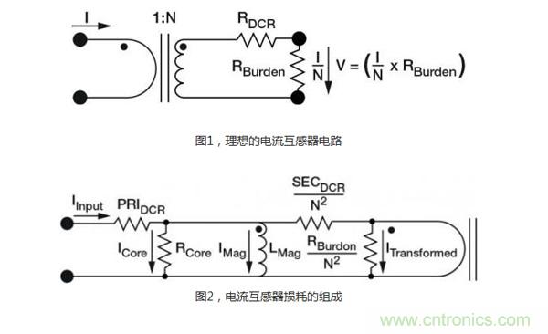 電流互感器(圖1)有三個突出優(yōu)點:與線電壓隔離,無損測量電流,大信號電壓能很好地抵御噪聲。這種間接測量電流的方法要求用到變化的電流,例如交流電,瞬變電流或開關(guān)式直流電,來產(chǎn)生一個磁耦合到次級繞組里的變化磁場。次級測量電壓可以根據(jù)在初級和次級繞組間的匝數(shù)比實現(xiàn)縮放。這種測量方法被認為是“無損的”,因為電路電流通過銅繞組時的電阻損耗非常小。但是,如圖2所示,由于負載電阻、芯損,以及初級和次級直流電阻的存在,互感器的損耗會導致失去一小部分能量。