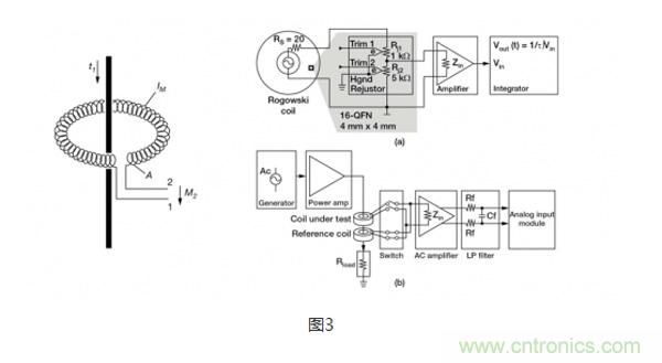 羅氏線圈(圖3)類似于電流互感器,會在次級線圈內(nèi)會感應(yīng)產(chǎn)生一個電壓,電壓大小與流經(jīng)隔離電感器的電流程正比。特殊之處在于,羅氏線圈采用的是氣芯設(shè)計,這一點與依賴層壓鋼等高磁導率鐵芯和次級繞組磁耦合的電流互感器完全不同。氣芯設(shè)計的電感較小,有更快的信號響應(yīng)和非常線性的信號電壓。由于采用了這種設(shè)計,羅氏線圈經(jīng)常被用在像手持電表這樣的已有接線上,臨時性地測量電流,可以認為是電流互感器的低成本替代方案。