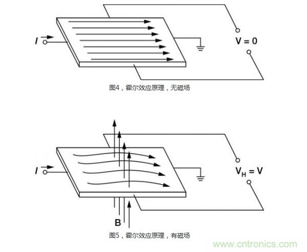 當一個帶電流的導體被放進磁場里時(圖4),在垂直于磁場和電流流動方向上會產(chǎn)生電位差。這個電位與電流大小成正比。在沒有磁場和電流流過時,就沒有電位差。但如圖5所示,當有磁場和電流流過時,電荷與磁場相互作用,引起電流分布發(fā)生變化,這樣就產(chǎn)生了霍爾電壓。