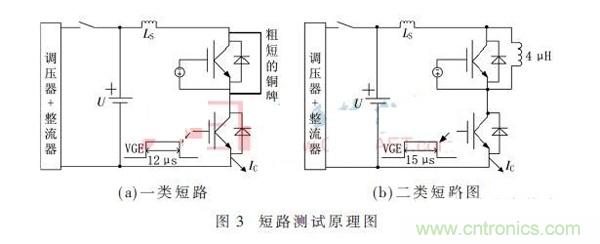 圖3(a)為一類短路測(cè)試原理圖,電網(wǎng)電壓經(jīng)過(guò)調(diào)壓器和整流橋,將母線電容電壓充到1 500 V,上管igbt的門極被-15 V關(guān)斷,且用粗短的銅排將其短路。對(duì)下管的IGBT釋放一個(gè)12 μs的單脈沖,直通就形成一類短路。圖3(b)為二類短路測(cè)試原理圖,將母線電容電壓同樣充到1 500 V,上管IGBT的門極被-15 V關(guān)斷,且給上管并聯(lián)一個(gè)4 μH的電感作為負(fù)載,下橋臂通過(guò)IGBT驅(qū)動(dòng)器釋放一個(gè)15 μs的單脈沖就形成二類短路。