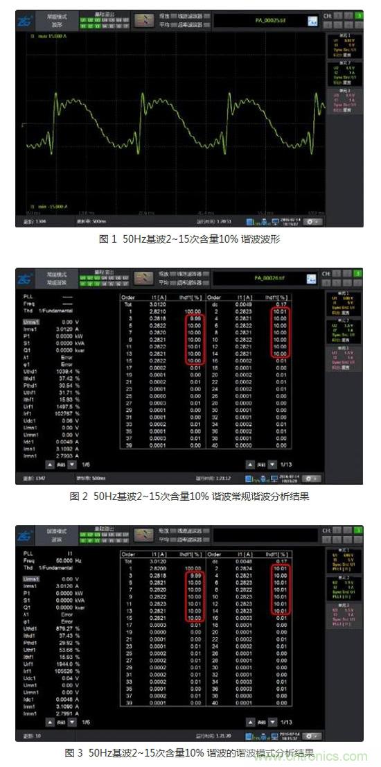 信號(hào)二:基波頻率50Hz,含2~15的奇次諧波,各次含量同樣均為10%