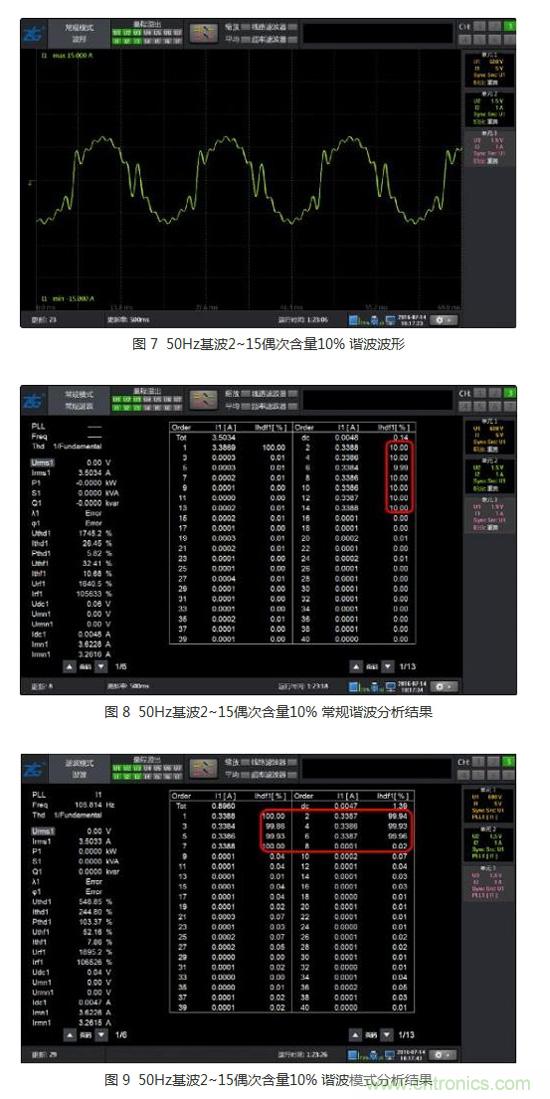 如圖 7所示只包含50Hz基波的2~15次的偶次諧波的波形,受偶次諧波的影響,每個(gè)基波周期多了兩次過零,而且頻率與基波相近,PLL的濾波器亦無法濾除該諧波,因此PLL結(jié)果錯(cuò)誤,導(dǎo)致諧波分析結(jié)果也完全錯(cuò)誤,此時(shí)的常規(guī)諧波分析結(jié)果仍然正確,而且保持了很高的精度。說明常規(guī)諧波可以不受偶次諧波影響,在采樣率和FFT點(diǎn)數(shù)足夠時(shí),具有受被測(cè)信號(hào)影響低的優(yōu)勢(shì)。