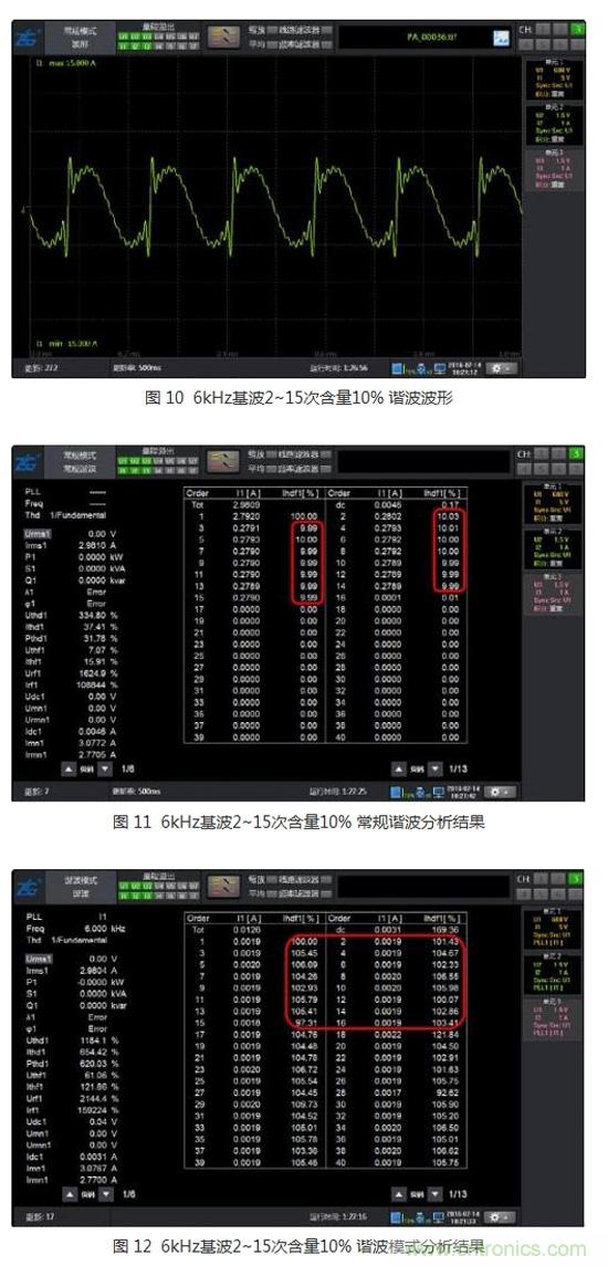 如圖 10 所示包含6kHz基波的2~15次諧波的波形,由于已經(jīng)超出諧波模式支持的頻率范圍,諧波模式無法測(cè)量,而常規(guī)諧波分析時(shí)使用了200kHz的采樣率,6kHz的15次諧波頻率為90kHz,小于采樣頻率的一半,因此仍然可以精確測(cè)量。