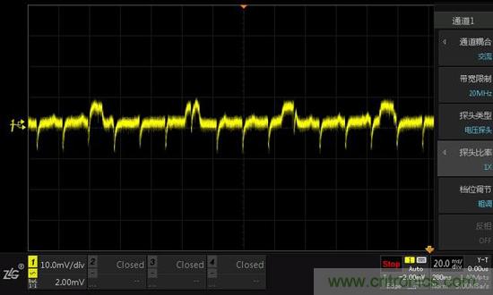 從圖5中可以看出,正確的紋波測量方式可以清晰的捕抓到正常的紋波,減少了不必要的噪聲和雜波對紋波的影響,基本上就是一條干凈的紋波了,在這樣的基礎(chǔ)上進行電源紋波測量,可以更精確的測量紋波的值,進而準確估測電源質(zhì)量。