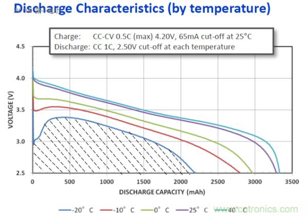 容量測試Output:溫度與容量(能量)關(guān)系表。以時間T為X軸,以電壓V為Y軸。不同溫度下1C放電截止在X軸上的點(diǎn)為容量與溫度的關(guān)系。而各個放電曲線與X、Y軸形成的面積之比就是不同溫度下的可用能量之比。如下圖所示:-20℃時的電池可用能量(Wh) = 陰影部分的面積S。由此可見,SOE比SOC能更加準(zhǔn)確的表示出剩余的能量,從而更準(zhǔn)確的評估剩余里程。
