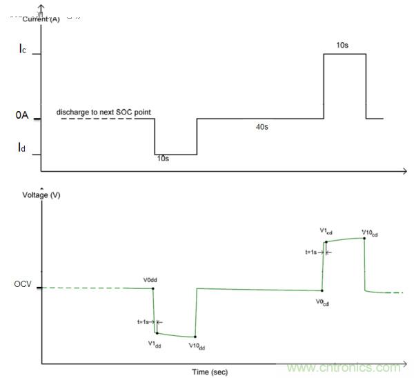 HPPC測試可測得電池的功率性能,開路電壓,直流內(nèi)阻等重要特性。HPPC測試制度是在某特定SOC目標(biāo)進(jìn)行10s脈沖放電,靜置40s,再10s脈沖充電。由此可測得該SOC點(diǎn)充電和放電方向的DCIR。需要注意的是在不同的測試方法下計算的DCIR會存在一定的差異。