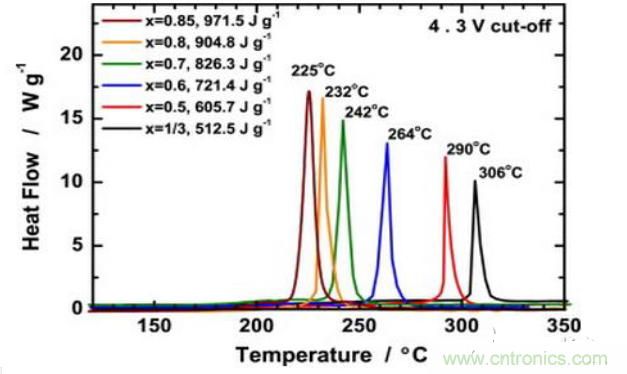 而且隨著NCM能量密度的不斷提高,材料的熱穩(wěn)定性會越來越差。下圖表述的是隨著Ni含量的升高材料的分解溫度逐漸下降。