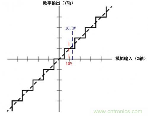 出現(xiàn)這種情況的原因首先是由測量設(shè)備內(nèi)部的ADC產(chǎn)生的量化誤差引起的,假設(shè)測量設(shè)備內(nèi)部包含一個11位的ADC,ADC共有211=2048個有效位,在1000V的量程(峰峰值)下,考慮最大±1000V的輸入共2048個有效位,則由于不可避免的噪聲的影響,ADC每跳動一個最小單位1LSB,產(chǎn)生的量化誤差大約會有2000V/2048≈1V。如果使用該量程測量10.3V這樣的信號,很顯然單次ADC取樣的最小分辨率已無法識別0.3V這樣刻度(在圖 2的量化示意圖中0.3V處在兩個刻度中間),當(dāng)然無法測得正確的值。如果無規(guī)則噪聲的峰值能大于1LSB時,多次采樣取平均值后可以提高測量系統(tǒng)的有效位數(shù),但這樣的因素不在我們考慮的范圍之內(nèi)。