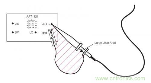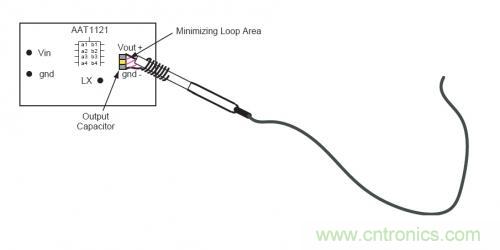 在測量中,如何減小拾取的輻射噪聲?最簡單可靠的方法是采用一個接地環(huán)來測量電源紋波以及噪聲。為了進(jìn)一步的降低測試誤差,可以將示波器探頭和地線直接放在電源輸出電容得兩端。如下圖所示,采用這種方法,在信號探頭和地線之間的環(huán)路面積很小,所以測量中帶來誤差的噪聲幾乎可以忽略。
