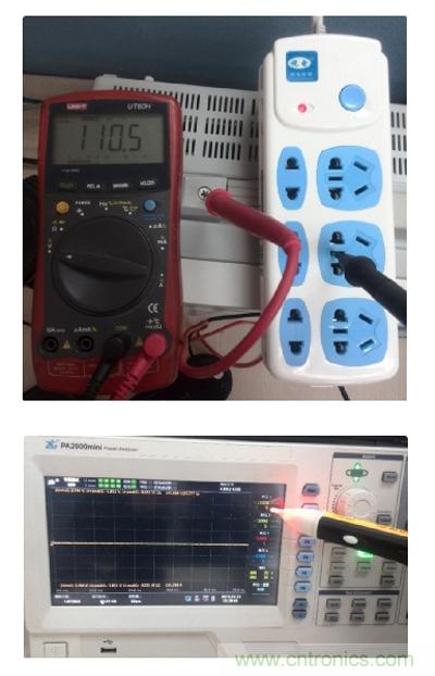 故意減掉PA2000mini功率分析儀的地線,這時(shí)候儀器處于接地不良的狀態(tài),機(jī)殼會(huì)帶110V電壓,會(huì)發(fā)生觸電危險(xiǎn)!