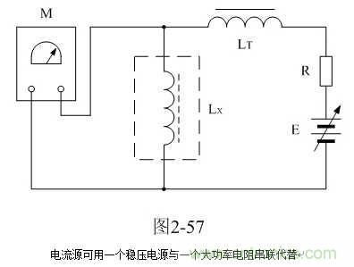 這里順便說明,采用圖2-54測(cè)試時(shí)應(yīng)該注意的地方。圖2-54中,隔離電感LT的大小要求是測(cè)試電感Lx數(shù)值的3倍以上,并且測(cè)量高壓包初級(jí)線圈的初始電感值L0時(shí),最好也要接入電路之中。這里,隔離電感LT可選取20毫亨以上的帶矽鋼片鐵芯的電感,電感的鐵芯要留有一定的氣隙;電流源可用一個(gè)穩(wěn)壓電源與一個(gè)大功率電阻串聯(lián)代替,如圖2-57;或用一個(gè)穩(wěn)壓電源與一個(gè)大功率晶體放大器串聯(lián)來(lái)代替,如圖2-58。