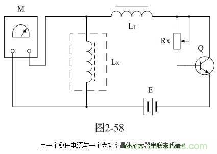 在圖2-58中,E為穩(wěn)壓電源,Rx為可調(diào)電阻,Q為晶體管大功率放大器(必須帶散熱片);調(diào)節(jié)穩(wěn)壓電源的電壓輸出,或改變可變電阻的阻值,就可以改變迭加電流的大小,但晶體管大功率放大器集電極與發(fā)射極之間的電壓降不要大于10V,否則,晶體管大功率放大器的損耗將很大。一般穩(wěn)壓電源都有電流輸出指示,所以在測(cè)試電路中不需要另外安裝電流表。