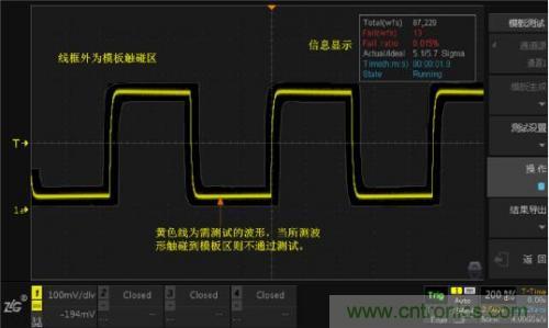 上圖就是模板測試的測試界面,其中,線框外為模板觸碰區(qū),波形接觸到該區(qū)域會被判定為不合格波形,即“Fail”。沒有接觸到模板觸碰區(qū)的波形為“Pass”。右上角顯示信息是模板測試中的一些狀態(tài)信息。