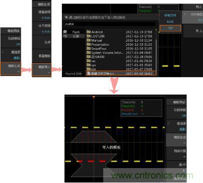 當原始波形沒辦法滿足我們對波形的限制時,用戶還可將儀器內(nèi)部Flash存儲器或外部U盤中存儲的測試模板文件導入,導入的波形可以是以前保存的*.msk文件或者是自行設置的*.txt文件。