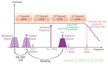 在數(shù)字化儀中,您可以考慮選擇超過采樣率(fn)一半的帶寬。有時(shí)可以通過欠采樣(undersampling)和特殊輸入濾波來捕獲大于 Fs/2 的頻率。例如,是德科技的 M9203A 和 M9703B 數(shù)字化儀支持 2 GHz 帶寬,ADC 采樣時(shí)鐘速率為 1.6 GS/s,允許使用欠采樣直接進(jìn)行下變頻。