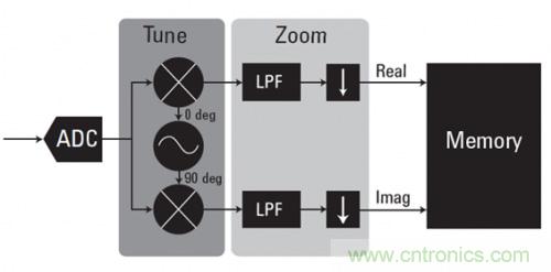 數(shù)字化儀采用諸如零抑制(zero suppress)等數(shù)據(jù)壓縮技術(shù),只保留超過給定閾值的相關(guān)信號(hào)。它們還使用數(shù)據(jù)打包和四舍五入來優(yōu)化可用存儲(chǔ)器空間。也使用諸如數(shù)字下變頻(DDC)等實(shí)時(shí)數(shù)據(jù)壓縮技術(shù)。DDC 直接在 ADC 數(shù)據(jù)上進(jìn)行數(shù)據(jù)的頻率轉(zhuǎn)換和抽取。圖 3 中的框圖顯示了其基本原理。捕獲到復(fù)雜的 IQ 數(shù)據(jù),可以使中心頻率下變頻到 0 Hz。然后使用濾波和數(shù)據(jù)抽取來去除不需要的頻率分量,縮減所需數(shù)據(jù)的大小。在對(duì)寬帶采集中的一小段頻譜進(jìn)行分析時(shí),DDC 非常有價(jià)值。DDC 不僅可以減少所需的存儲(chǔ)空間,而且可以降低寬帶綜合噪聲,改善整體信噪比(SNR)。