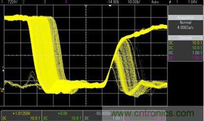 圖 4. 示波器具有超過每秒 1,000,000 個(gè)波形的更新速率,讓用戶可以看到意外事件和毛刺。