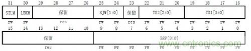 簡單的了解了CAN總線位時間的分段后,我們來看看一個節(jié)點的波特率到底要如何設(shè)置。如圖2是某ARM內(nèi)核的CAN位時間特性寄存器 (CAN_BTR)。
