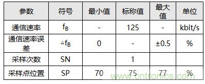 例如某著名車廠CAN通信標(biāo)準(zhǔn)里規(guī)定,通信速率為125 kbps時,應(yīng)該采用單次采樣,采樣點位置設(shè)置在70%~77%之間。其位定時參數(shù)取值可見表1與表2。