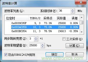 了解設(shè)置波特率的原則后,我們采用ZLG的波特率計算軟件,對25kbps波特率的設(shè)置參數(shù)進行計算,計算結(jié)果如圖3。
