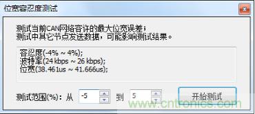 l位寬容忍度測試:采用CANScope對當(dāng)前波特率下CAN卡進行位寬容忍度測試,測試其對波特率的容忍度情況,測試結(jié)果為24kbps~26kbps,容忍度情況較好;