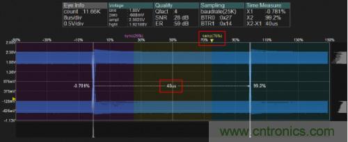l位時間測試:用CANScope的眼圖功能對當(dāng)前波特率下CAN卡進行位時間測試,位時間為40us,與25kbps波特率的位時間相符。