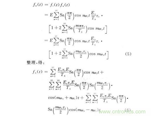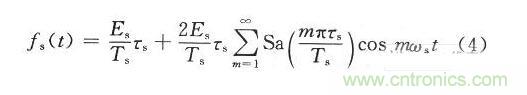 式中:E,ωi分別為輸入信號(hào)的幅度和角頻率。設(shè)采樣脈沖信號(hào)為fs(t),采樣后的信號(hào)為fo(t),則采樣過(guò)程在時(shí)域上的數(shù)學(xué)表示式為fo(t)=fi(t)fs(t),在DRFM中采用等間隔均勻采樣,采樣周期為Ts,采樣時(shí)鐘頻率ωs=2πfs。在實(shí)際電路中,采樣是在采樣脈沖上升的瞬間完成的。因此采樣脈沖的寬度可以看成一個(gè)窄脈寬,用τs。來(lái)表示。采樣脈沖的傅里葉級(jí)數(shù)為: