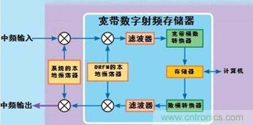 數(shù)字射頻存儲(chǔ)(DRFM)的基本工作原理:首先將輸入射頻信號(hào)下變頻為中頻信號(hào),經(jīng)A/D變換后成為數(shù)字信號(hào),寫入高速存儲(chǔ)器中。當(dāng)需要重發(fā)這一信號(hào)時(shí),在控制器控制下讀出此數(shù)字信號(hào)并由D/A變換為模擬信號(hào)。然后用同一本振作上變頻,得到射頻輸出信號(hào),完成對(duì)輸人信號(hào)的存儲(chǔ)轉(zhuǎn)發(fā)。