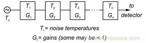 圖1:以天線或其他來源的等效噪聲溫度為起點(diǎn),累加各階段的噪聲溫度可確定系統(tǒng)中各點(diǎn)的噪聲。(圖片來源:新澤西理工學(xué)院)