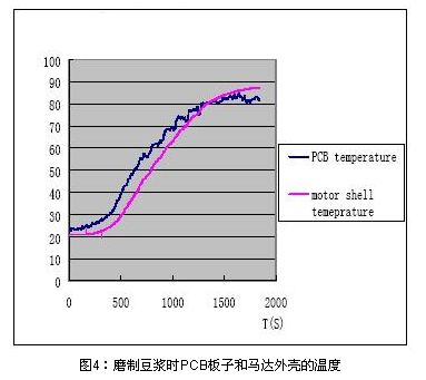 用上文所述的PPTC設(shè)計(jì)流程可以用在多功能豆?jié){機(jī)馬達(dá)防堵保護(hù)設(shè)計(jì)中,但這是往往會碰到選擇PPTC型號困難的問題,也就是說多功能豆?jié){機(jī)的馬達(dá)保護(hù)設(shè)計(jì)會較普通的小家電馬達(dá)保護(hù)復(fù)雜的多,圖4為磨制豆?jié){時PCB板周圍環(huán)境溫度和馬達(dá)外殼溫度的實(shí)測圖,可見控制電路PCB板PPTC周圍的環(huán)境溫度最高可以到達(dá)85C。由于豆?jié){機(jī)的PPTC最高環(huán)境溫度85度會比普通的小家電最高環(huán)境溫度要求高,這樣既要在85度的最大工作電流下能正常工作,還要保證在最低溫度0度的堵轉(zhuǎn)電流情況下能及時的保護(hù),相應(yīng)的就增大了設(shè)計(jì)難度。下面就具體的闡述此類多功能豆?jié){機(jī)馬達(dá)堵轉(zhuǎn)的保護(hù)設(shè)計(jì)方案。