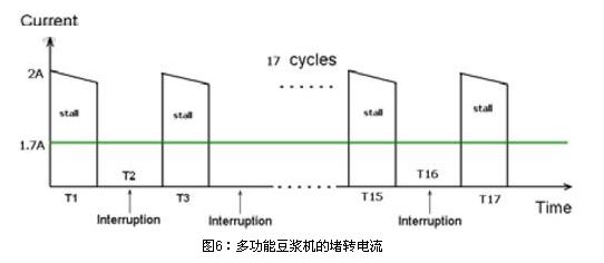 圖6為多功能豆?jié){機(jī)的堵轉(zhuǎn)電流。在榨水果的堵轉(zhuǎn)情況下,實(shí)測馬達(dá)的堵轉(zhuǎn)最大電流為2A,由于榨果汁時馬達(dá)也不是一直連續(xù)工作的,也是間隔一定時間工作,間隔時間是馬達(dá)工作6S,停3S,這樣換算成在一個榨水果完整工作周期內(nèi)平均電流是1.6~1.7A。在1.6~1.7A堵轉(zhuǎn)電流下,馬達(dá)堵轉(zhuǎn)需要保護(hù)的時間要求在150S內(nèi)。