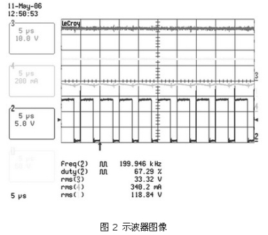 圖 2 、圖3 及表 2、表3 顯示了這種電路在90 ~265 VAC的通用輸入電壓范圍內(nèi),以350 mA驅(qū)動兩個有6個串聯(lián)LUXEON FLOOD 25-0032 HB-LED板時的結果。表 2 顯示了在輸入電壓范圍內(nèi)良好的電流調(diào)節(jié)。圖 2 和圖3 說明了正如理論所示的,由于占空比較小,輸入電壓較高時紋波較差。這表明在主電壓較低的地區(qū),如北美和日本,設備性能更加良好。然而,即使在最差的條件下,只要控制器輸入電壓保持在90 ~265 VAC的范圍內(nèi),仍可對電流進行適時調(diào)節(jié)。同時對只使用6個HB-LED板的系統(tǒng)進行了測量(見表 3) ,對比結果發(fā)現(xiàn),±1.3%的調(diào)節(jié)差距導致負載電壓的差距高達33.4V ~16.4V。