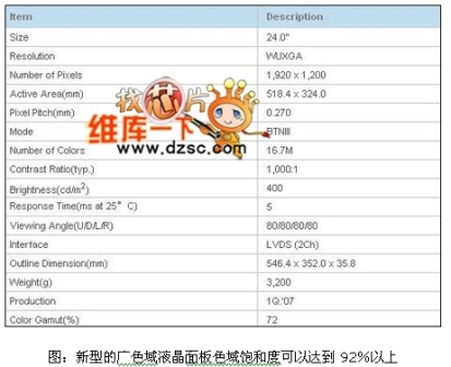 新型的W-CCFL(廣色域背光燈管)能夠相當(dāng)程度的改善色域呈現(xiàn)問題,有效加強(qiáng)顏色飽和度,如果搭配新型的多色濾光片(在RGB三原色以外多加如黃色、青色或白色等顏色的濾光片,借以增加顏色呈現(xiàn)能力),在顯示能力上還能夠進(jìn)一步提升。濾光片對色域表現(xiàn)有所幫助,但是幅度不大,影響色域呈現(xiàn)能力主要還是在背光模組技術(shù)方面。W-CCFL只是在螢光材質(zhì)進(jìn)行改良,僅僅更換W-CCFL背光模組,就能將色域飽和度從原本的72%NTSC提升到92%NTSC的程度,且?guī)缀醪粫黾映杀?,因此各大液晶監(jiān)視器或液晶電視制造公司也開始大幅采用此種背光技術(shù),只要是色域范圍在NTSC90%左右者,幾乎都是此類燈管。