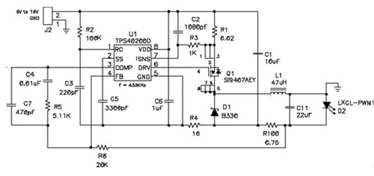 在輸出電壓始終小于輸入電壓的情況下,應(yīng)使用降壓穩(wěn)壓器,圖5顯示了該拓?fù)浣Y(jié)構(gòu)。在該電路中,對(duì)電源開關(guān)的占空比 (duty factor) 進(jìn)行了控制,以在輸出濾波器電感 L1 上確立平均電壓。當(dāng)FET開關(guān)閉合時(shí)(TPS5430 內(nèi)部),其將輸入電壓連接到電感器,并在L1中構(gòu)建電流。D2為環(huán)流二極管 (catch diode),可提供開關(guān)斷開時(shí)的電流路徑。電感器可對(duì)流過LED的電流起到平滑的作用,該工作可通過用電阻監(jiān)控(測量)LED電流,并將電壓與控制芯片內(nèi)部的參考電壓進(jìn)行比較,最終進(jìn)行調(diào)節(jié)。如果電流太低,則占空比增加,平均電壓也上升,從而也導(dǎo)致了電流的升高。該電路具有極佳的效率,因?yàn)殡娫撮_關(guān)、環(huán)流二極管以及電流感測電阻上的壓降非常低。