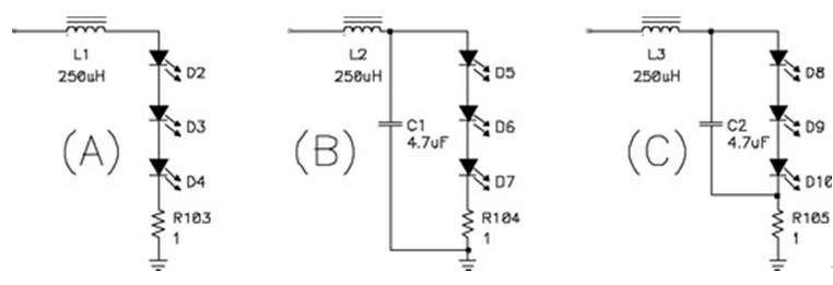 關(guān)閉 LED 電源上的電流環(huán)路比關(guān)閉傳統(tǒng)電源上的電壓環(huán)路簡單。環(huán)路的復(fù)雜性取決于輸出濾波器的配置。圖8顯示了三種可能的配置:只有一個(gè)簡單電感器的濾波器(A);一個(gè)典型的電源濾波器(B);以及一個(gè)修正后的濾波器(C)。
