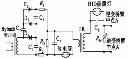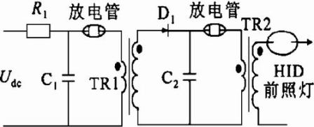 啟動期間,電子鎮(zhèn)流器要經(jīng)歷高壓擊穿、電流接續(xù)、預(yù)熱維弧3個(gè)階段。高壓啟動電路是HID 前照燈能否瞬間點(diǎn)亮的基礎(chǔ)。但輝光放電后慣性和濾波延遲使直流變換器和檢測回路很難有較快的響應(yīng)速度,所以需要如圖1所示的電流接續(xù)(take-over) 電路,它可利用電容預(yù)先儲存的能量為燈提供一個(gè)較大的瞬間電流(約300ms) ,保證輝弧可靠過渡。一般高壓發(fā)生電路有以下幾種: