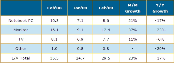 DisplaySearch上海辦公室,2009年3月23日 --- 根據(jù)DisplaySearchy最新關(guān)于全球TFT LCD出貨調(diào)查指出,二月份大尺寸面板出貨量為2千950萬片,較上月大幅成長23%,營收直逼29.5億美元,較上月成長14%,這是自2008年九月份以來首次見到成長的月份。二月份的良好表現(xiàn)主要來自于急單效應(yīng)與客戶持續(xù)補(bǔ)充庫存,也是TFT LCD產(chǎn)業(yè)即將觸底反彈的信號。