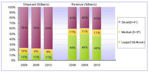 再從出貨尺寸別來看,主要觸控面板的出貨尺寸集中在4寸以下(含4寸),2008年出貨量為3億6,000萬片,占整體市場比重將近79%。同樣地,受到全球經(jīng)濟衰退的影響,2009年在4寸以下(含4寸)的出貨量雖然目前看來將維持與2008年相仿的水準,但到了2010年預計將會有2%的成長幅度。
