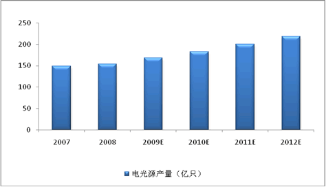 中國電光源(燈泡)行業(yè)能夠持續(xù)快速穩(wěn)定的發(fā)展,其中很重要的原因是產(chǎn)品面向國際和中國兩大市場。在中國和國外消費市場推動下,2008年中國電光源產(chǎn)量達154億只,較2007年同比增長3.5%。隨著中國電光源質(zhì)量和技術(shù)標準的提升,預計未來中國電光源產(chǎn)量增長率將為維持9%-12%之間。