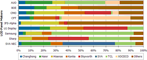 - 以第二季數(shù)據(jù)來看,大部分中國電視整機(jī)廠商大多數(shù)都是自家工廠生產(chǎn),不過目前有部份廠商如長虹(Changhong)、海爾(Haier)與創(chuàng)維(Skyworth)等將部份電視機(jī)委外代工,TPV為其中一家代工廠商。