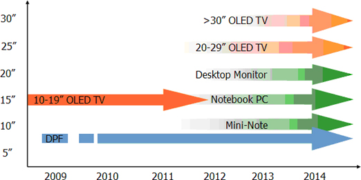隨著技術(shù)進(jìn)步,DisplaySearch預(yù)估AMOLED將進(jìn)一步朝中大尺寸方向發(fā)展。筆記本計算機(jī)將是AMOLED廠商下一個關(guān)注的應(yīng)用方向,我們估計自2010年年中,廠商將有機(jī)會將AMOLED應(yīng)用在筆記本計算機(jī)上,而采用AMOLED面板上網(wǎng)本將有機(jī)會于2010年底開始量產(chǎn)。在TV方面,我們預(yù)期2010年底將會有大于20寸AMOLED TV被生產(chǎn),同時預(yù)期2011年大于30寸AMOLED TV 將會進(jìn)入市場中。