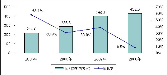 2008年受全球金融危機(jī)的影響,液晶面板的市場需求量出現(xiàn)大幅萎縮。2008年全球大尺寸(大于10英寸)TFT-LCD面板銷售量達(dá)到4.32億片,比去年3.98億片的銷售量僅僅增長8.5%,遠(yuǎn)低于2007年39.0%的增長率,創(chuàng)近5年市場增長率最低。