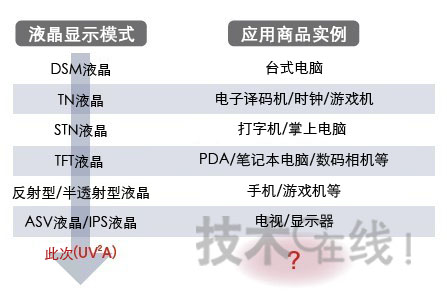 液晶顯示模式每進(jìn)一步,都會(huì)創(chuàng)造出新應(yīng)用商品。UV2A是夏普創(chuàng)造的詞,意思是使用UV的VA。(圖:本站根據(jù)夏普的資料制成)