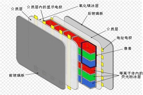 PDP是Plasma Display Panel的簡寫,也就是等離子體顯示器。PDP顯示器的工作原理是,通過加電,讓等離子汽體(一般為惰性氣體)在強(qiáng)電場中放電產(chǎn)生紫外線,然后通過紫外線激發(fā)熒光粉發(fā)光,PDP顯示器的工作原理如圖5所示,其結(jié)構(gòu)如圖6所示。