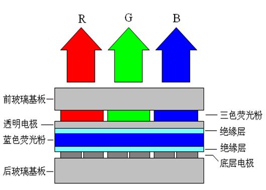 TDEL(Thick-film Dialectric Electroluminescent Technology)顯示器的原理是在兩個極板之間(其中一個極板是透明電極),安置一整片藍(lán)色場致發(fā)光材料,再在其上面再分別安置紅色和綠色顏料,混合成三色的RGB影像。由于不須要像等離子電視一樣復(fù)雜的組件,也不須要LCD的背光,37"的TDEL電視樣品厚僅2cm,重量則甚至不到一公斤。從技術(shù)性能以及性能價(jià)格比方面進(jìn)行比較,TDEL顯示器要比PDP和LCD顯示器好,應(yīng)該說是一項(xiàng)比較有發(fā)展前途的平板顯示器,但由于產(chǎn)業(yè)鏈遲遲建立不起來,所以很少人使用。圖8是TDEL顯示器的工作原理圖。