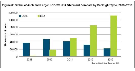 - 到 2013 年,83.2%的40 英寸以及更大的液晶電視將使用LED 背光