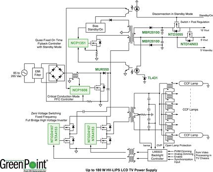 例如,目前市場(chǎng)上銷量最大的是32英寸液晶電視。在這類液晶電視中,采用標(biāo)準(zhǔn)24V逆變器電源的方案在市場(chǎng)上仍占據(jù)多數(shù),但新興的高壓液晶電視集成電源(HV-LIPS)的應(yīng)用也在不斷增多,總體上呈現(xiàn)出并存的態(tài)勢(shì)。采用標(biāo)準(zhǔn)24V逆變器的傳統(tǒng)液晶電視在接受110/220Vac市電輸入后,經(jīng)過整流、PFC及濾波,轉(zhuǎn)換為200/400Vdc的直流高壓。由于傳統(tǒng)高壓逆變器的輸入電壓要求是24Vdc,故PFC的輸出電壓200/400Vdc會(huì)經(jīng)過降壓轉(zhuǎn)換,產(chǎn)生多路輸出電壓,其中一路24Vdc電壓提供給高壓逆變器,再經(jīng)過DC-AC轉(zhuǎn)換為超過1,000V甚至達(dá)2,000V的交流高壓,去驅(qū)動(dòng)液晶面板的CCFL陣列。安森美半導(dǎo)體為這類傳統(tǒng)液晶電視推出了220W液晶電視電源GreenPoint®參考設(shè)計(jì),其中采用的關(guān)鍵元器件包括NCP1606CrMPFC控制器、NCP1396諧振半橋控制器及NCP1027待機(jī)控制器等。