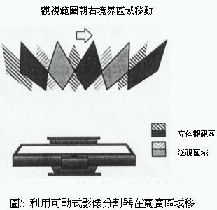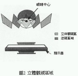 利用這種原理可以針對觀視者觀賞畫面時的最適當位置,除了提供觀視者左右兩眼影像之外,由影像正面的顯示區(qū)到最適距離所函蓋的區(qū)域,對觀視者而言就變成正常的立體三次元影像。不過兩眼視線相鄰處的影像,會被左、右兩眼在無意識狀態(tài)下捕捉讀取形成所謂的逆視領(lǐng)域,換句話說使用這種三維立體影像分割器的觀視者必需固定在一定的觀視位置才能產(chǎn)生立體視覺效果(圖2)。