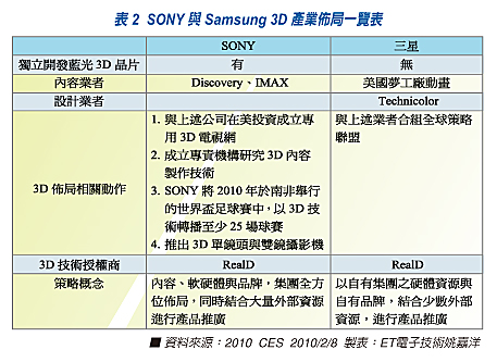 前陣子在拉斯維加斯舉辦的CES展,不止讓業(yè)界感受到景氣明顯回春外,另一方面,也讓各家消費性電子大廠也不約而同推出3DTV,似乎有志一同的全球宣示:3D顯示來了!!,然而,在TV市場一向是死對頭的SONY與三星,也同樣在3DTV領域,各自集結大軍,欲在該領域取得先進者優(yōu)勢地位,以宣示:我才是真正的消費性電子大廠的龍頭。